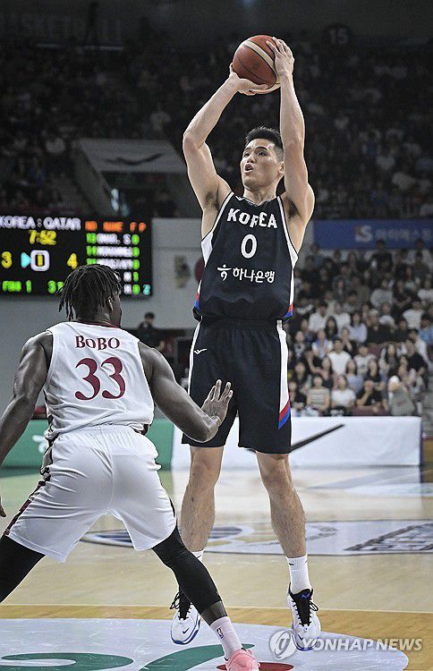 (서울=연합뉴스) 20일 경기도 안양정관장아레나에서 열린 하나은행 초청 2025 남자농구 국가대표 평가전 카타르와의 경기에서 하윤기가 슛을 하고 있다. 2025.7.20 [대한민국농구협회 제공, 재판매 및 DB 금지]
