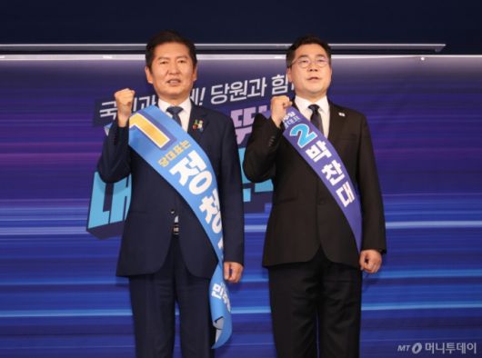 정 후보는 20일 민주당 대표 및 최고위원 선출을 위한 제2차 임시전국당원대회 영남권(부산·울산·경남·대구·경북) 순회경선 결과 4만869표를 얻어 득표율 62.55%를 기록했다. 박찬대 후보는 2만4464표로 득표율 37.45%였다.