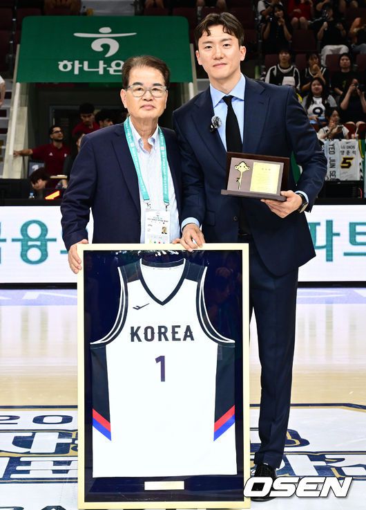 [OSEN=안양, 조은정 기자]20일 안양 정관장 아레나에서 한국 남자농구 대표팀과 카타르 대표팀의 2차 평가전이 열렸다. 하프타임에 한국 남자 농구 대표팀 출신 박찬희의 은퇴식이 진행됐다. 박찬희 코치가 권혁운 대한민국농구협회장과 포즈를 취하고 있다. 2025.07.20 /cej@osen.co.kr