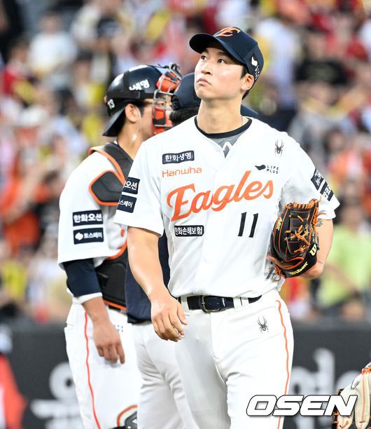 [OSEN=대전, 이대선 기자] 9일 오후 대전 한화생명볼파크에서 2025 신한 SOL Bank KBO리그 한화 이글스와 KIA 타이거즈의 경기가 열렸다.한화는 문동주, KIA는 양현종 선발로 내세웠다.4회초 1사 2루에서 한화 엄상백이 마운드를 내려가고 있다. 2025.07.08 /sunday@osen.co.kr |