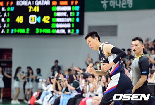 [OSEN=안양, 조은정 기자]20일 안양 정관장 아레나에서 한국 남자농구 대표팀과 카타르 대표팀의 2차 평가전이 열렸다. 안준호 감독이 이끄는 남자농구대표팀은 지난 18일 같은 장소에서 개최된 카타르와 1차 평가전에서 90-71로 승리했다. 3쿼터 대한민국 이우석이 3점슛 성공 후 기뻐하고 있다. 2025.07.20 /cej@osen.co.kr