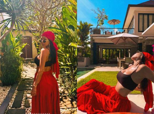 블랙 브라톱과 강렬한 레드 롱스커트를 매치하고, 머리에는 같은 색상의 스카프를 두른 채 선글라스와 볼드한 골드 후프 귀걸이로 포인트를 더했다. 햇빛 아래 드러난 탄탄한 복근과 건강미 넘치는 몸매는 단숨에 시선을 사로잡는다.
