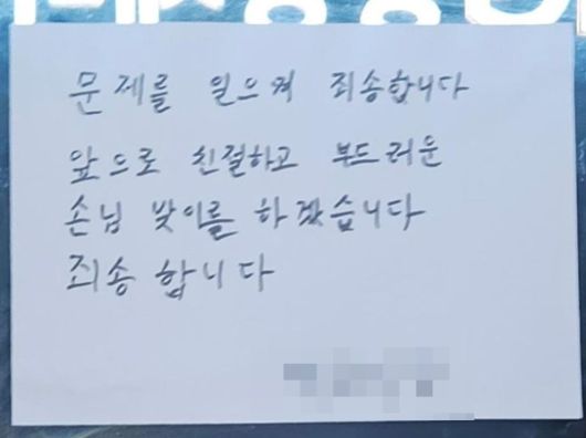 20일 온라인 커뮤니티에는 이 식당의 출입문에 A4 용지로 사과문이 부착된 모습이 올라왔다. 사과문에는 자필로 “문제를 일으켜 죄송합니다. 앞으로 친절하고 부드러운 손님 맞이를 하겠습니다. 죄송합니다”라고 적혀있다.