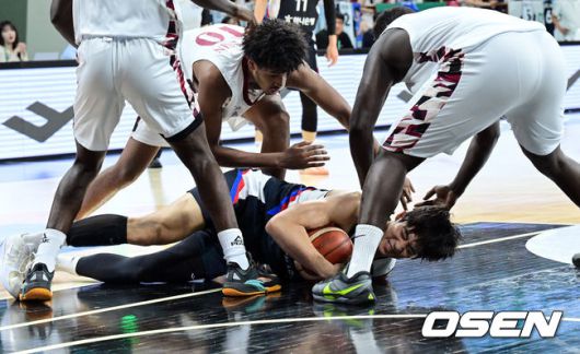 [OSEN=안양, 조은정 기자]20일 안양 정관장 아레나에서 한국 남자농구 대표팀과 카타르 대표팀의 2차 평가전이 열렸다. 안준호 감독이 이끄는 남자농구대표팀은 지난 18일 같은 장소에서 개최된 카타르와 1차 평가전에서 90-71로 승리했다. 4쿼터 대한민국 여준석이 볼다툼 중 넘어지고 있다. 2025.07.20 /cej@osen.co.kr