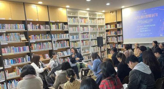 필자(오른쪽 셋째)가 수술을 이틀 앞둔 지난 3월8일 경기 파주시 금촌무지개작은도서관에서 ‘파주이주민문학회’ 동료들과 시 콘서트를 마치고 기념사진을 찍고 있다. 필자 제공 |