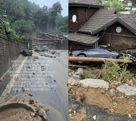그는 사진과 함께 "전화는 이제야 연결됐지만 도로는 유실돼 고립된 상태"라며 "전기도 끊기고 물도 안 나온다. 많은 분이 걱정해주시는데 저희 마을은 인명 피해가 없는 상태인데 다른 마을에는 큰 피해가 있다"고 적었다.