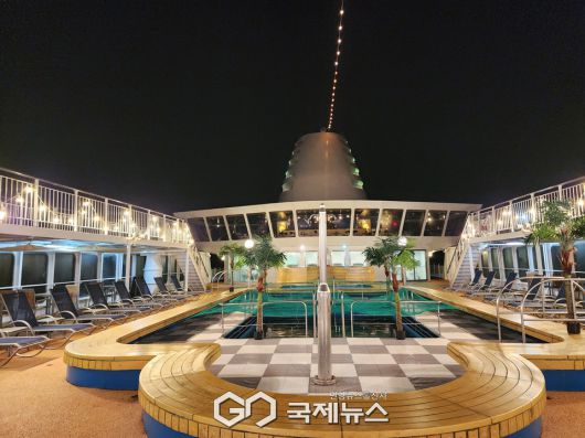 (부산=국제뉴스) 유지현 기자 = 27일 부산항국제여객터미널을 출항해 일본 사세보로 향하는 크루즈 이스턴 비너스(Eastern Venus) 호 선상의 밤.
