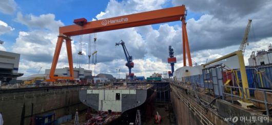 한화필리조선소 5도크에서 국가안보다목적선박(NSMV) 마무리 공정이 진행되고 있다. /사진제공=한화오션 |