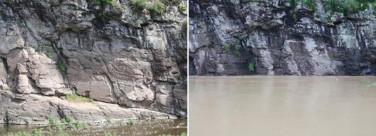 유네스코 세계문화유산으로 등재된 국보 제285호 울산 울주군 '대곡리 반구대 암각화'(왼쪽 사진)가 19일 물에 잠겨 있다(오른쪽). 울산=연합뉴스 |