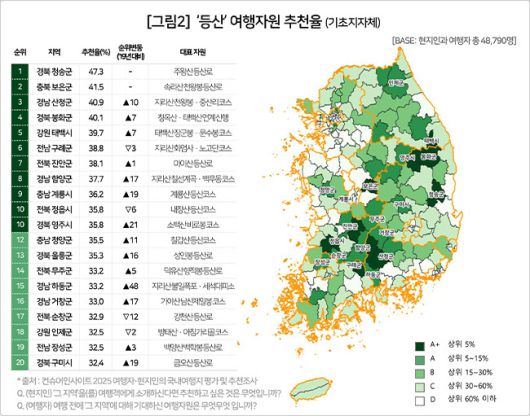 ‘등산’ 항목에서도 청송군이 1위(47.3%)를 기록했으며, 보은군(41.5%)과 산청군(40.9%)이 그 뒤를 이었다. 산·계곡과 등산 항목에서 상위권을 차지한 지자체는 대부분 중복되며, 상위 20위 중 13곳이 동일 지역인 것으로 나타났다. 이는 산림을 기반으로 한 여행 활동의 높은 연관성을 보여준다.