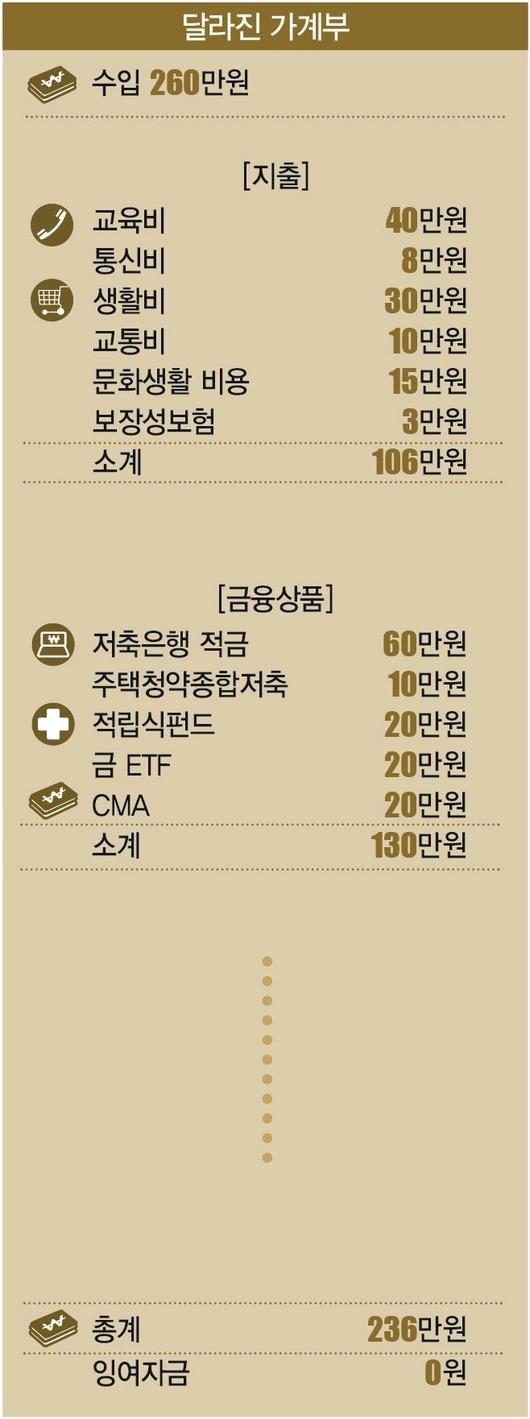 기존에 소비성 지출로 쓰고 있던 176만원은 생활비 20만원(50만원→30만원), 교통비 12만원(22만원→10만원), 문화생활비 13만원(28만원→15만원), 건강보험료 13만원(16만원→3만원), 비정기지출 12만원(12만원→0원) 등 70만원을 줄이는 데 성공했다.