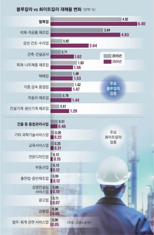 대표적인 블루칼라 업종인 강선 건조·수리업은 2015년 사고·질병 재해자가 1906명이었지만 지난해 3490명으로 증가했다. 재해율도 0.82%에서 2.64%로 늘었다. 이 외에도 재해율을 놓고 봤을 때 ▲건축·건설 공사업(0.71%→1.62%) ▲자동차 제조업(0.78%→1.44%) ▲건설기계·광산기계 제조업(0.61%→1.29%) 등도 산재가 더 잦아진 것으로 분석됐다. 반면 화이트칼라로 분류되는 ▲법무·회계 관련 서비스업(0.06%→0.05%) ▲광고업(0.11%→0.07%) ▲부동산업(0.13%→0.12%) 등은 재해율에 큰 변화가 없거나 오히려 줄었다.