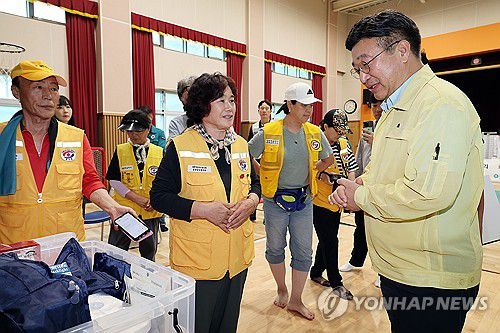 (서울=연합뉴스) 윤호중 행정안전부 장관이 20일 호우 피해를 입은 충남 예산군 임시주거시설을 방문해 자원봉사자들을 위로하고 있다. 2025.7.20 [행정안전부 제공. 재판매 및 DB 금지]