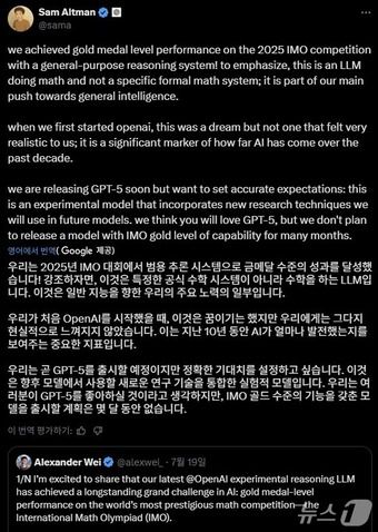 샘 올트먼 오픈AI 최고경영자(CEO)는 X(옛 트위터)를 통해 "범용 추론 거대언어모델(LLM)로 2025년 IMO에서 금메달 수준의 성과를 달성했다"며 "10년간 AI가 얼마나 발전했는지를 보여주는 중요한 지표"라고 말했다.