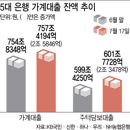 이런 상황에서 추가 대출 규제가 나올 가능성도 여전하다. 이달 초까지 전월의 40% 수준으로 떨어졌던 가계대출 증가 속도가 중순 이후 다시 빨라지고 있다. 아직 대출 수요 급감을 기대하기 이르다는 뜻이다. 5대 은행의 지난 17일 기준 가계대출 잔액은 757조 4194억원으로 6월 말(754조 8348억원)보다 2조 5846억원 늘었다. 하루 평균 증가액이 1520억원으로 6월(2251억원)의 68% 수준이다. 이 추세대로라면 이달 말까지 4조 7000억원 가량의 가계대출이 늘 것으로 보인다. 대출 종류별로 보면 주택담보대출이 전달보다 2조 3478억원 늘었다. 하루 평균 1381억원으로 6월(1921억원)의 약 72%에 해당한다.