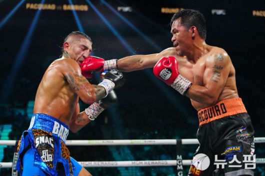 [라스베이거스 로이터=뉴스핌] 장환수 스포츠전문기자= 8체급 석권의 복싱 전설 매니 파키아오(오른쪽)가 20일 46세의 나이에 4년 만의 복귀전인 마리오 바리오스와 WBC 웰터급 타이틀전에서 강력한 오른손 스트레이트를 작렬시키고 있다. 2025.07.20 zangpabo@newspim.com |