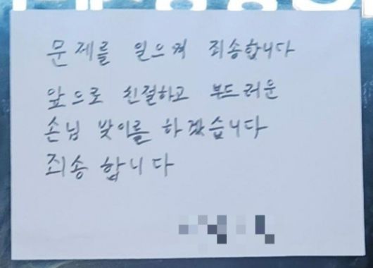 사과문에는 자필로 “문제를 일으켜 죄송합니다. 앞으로 친절하고 부드러운 손님 맞이를 하겠습니다. 죄송합니다”라는 글귀가 적혔다.