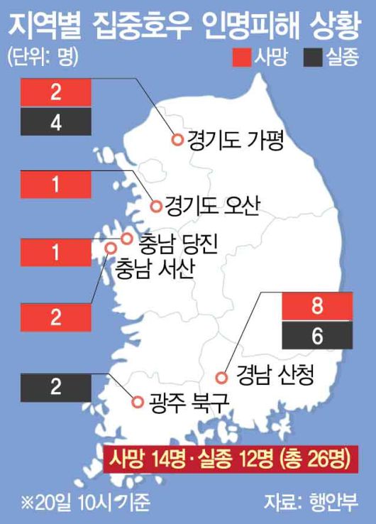 행정안전부 중앙재난안전대책본부에 따르면 16일 자정부터 이날 오후 6시까지 전국에서 발생한 인명 피해는 사망 17명, 실종 11명 등 총 28명으로 집계됐다. 지역별로 보면 사망자는 경기 3명 (오산 1, 가평 2), 충남 3명(서산 2, 당진 1), 경남 산청 10명, 광주 북구 1명이었다. 실종자는 광주 북구에서 1명, 경기 6명(가평 5, 포천 1), 산청에서 4명이 나왔다. 이날까지 총 1만 3492명이 극한호우로 대피했으며 미귀가 인원은 2728명으로 집계됐다. 특히 산청에서는 전 군민이 대피하는 초유의 사태가 벌어졌다. 이달 16일부터 이날 오전 10시까지 산청군에 내린 비는 793.5㎜로 지난해 전체 강수량(1513.5㎜)의 절반을 넘어섰다. 이에 산청군은 전날 1시 50분께 전 군민을 대상으로 ‘지금 즉시 안전지대로 대피하라’는 긴급재난문자를 보냈다.