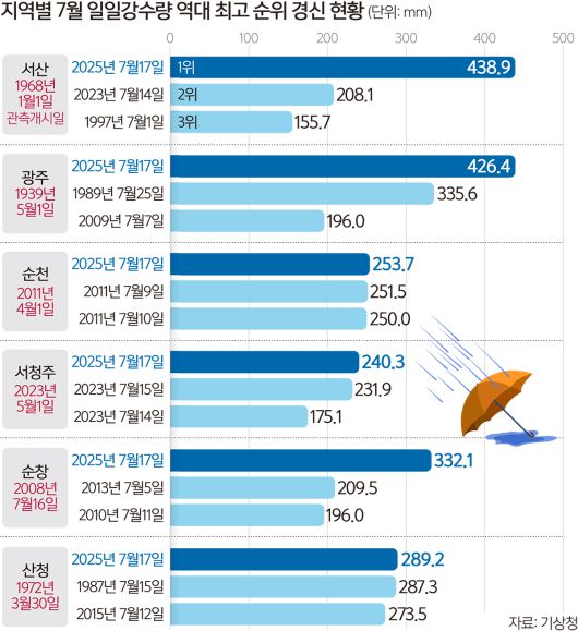 서산의 경우 17일 하루에만 438.9㎜의 비가 내려 2023년 7월14일(208.1㎜) 일강수량 최고 기록을 두 배 넘게 뛰어넘었다. 1939년부터 기상관측을 시작한 광주도 같은 날 426.4㎜로 7월 일강수량 극값을 경신했다. 이전 기록은 1989년 7월25일 내린 335.6㎜이다. 이 외에도 전북 고창(196.7㎜), 전남 순천(253.7㎜), 충북 서청주(240.3㎜), 충남 천안(301.1㎜), 전북 순창(332.1㎜), 경남 산청(289.2㎜) 등이 같은 날 최고치를 썼다. 경남 합천은 19일 280.1㎜가 쏟아져 이전 기록인 1987년 7월15일(213.5㎜)보다 더 많은 비가 내렸다. 기상청에 따르면 7월 일강수량 극값을 경신한 곳은 13곳에 달한다. 2위 기록을 쓴 곳도 6곳이다.
