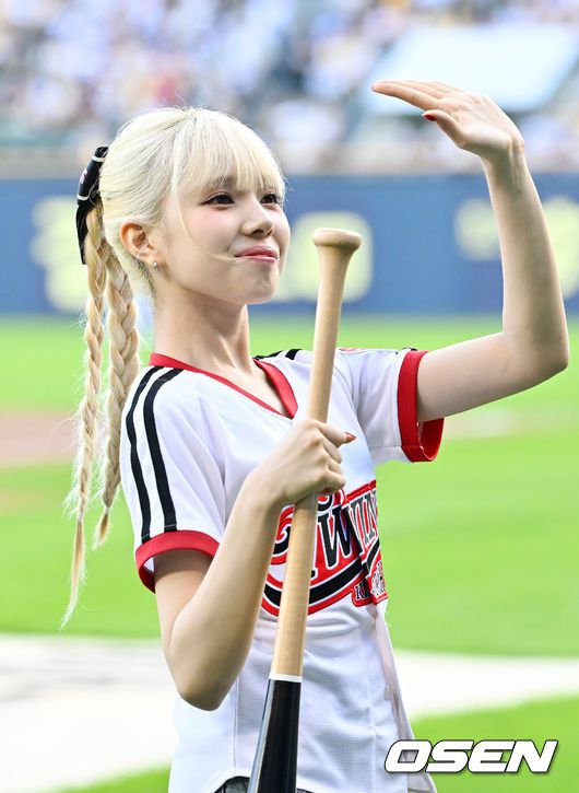 [OSEN=잠실, 민경훈 기자] 20일 오후 서울 잠실구장에서 ‘2025 신한 SOL BANK KBO리그’ LG 트윈스와 롯데 자이언츠의 경기가 열렸다. 이날 경기에서 LG는 임찬규를, 롯데는 이민석을 선발투수로 내세웠다. 경기 전 그룹 베이비돈크라이(Baby DONT Cry)의 미아가 시타를 마친 후 인사를 하고 있다. 2025.07.20 / rumi@osen.co.kr