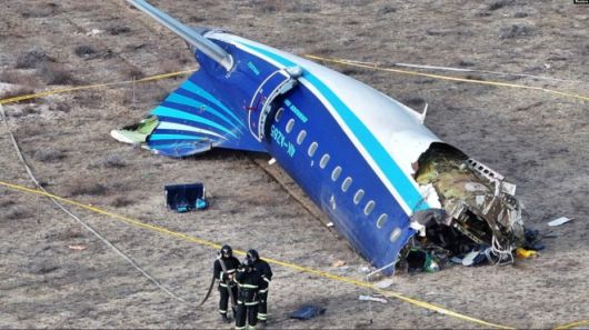 2024년 12월 25일, 바쿠를 출발해 러시아 그로즈니로 향하던 아제르바이잔 항공 여객기(J2 8243편)가 카자흐스탄 서부 악타우 인근에서 추락해 38명이 사망했다. 사진은 추락한 아제르바이잔 여객기 동체. 로이터 연합뉴스 |