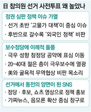 이런 가운데 선거 종반의 흐름은 외국인 문제가 핵심이 됐다. ‘일본인 퍼스트’를 내세운 극우 성향의 참정당이 인기몰이하는 가운데 SNS 등에서 외국인이 의료 서비스와 생활보호 제도 이용 시 특별한 대우를 받고 있다는 근거 없는 소문이 확산된 것이다.