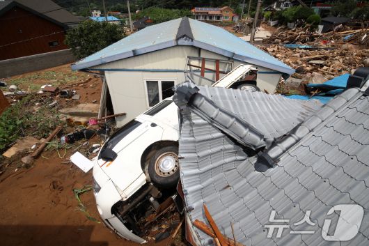 경남 산청군 산청읍 외정마을에 폭우와 산사태로 토사가 흘러내려 주택 등이 파손되는 등 아수라장을 방불케 하고 있다. 2025.7.20/뉴스1 ⓒ News1 윤일지 기자 |