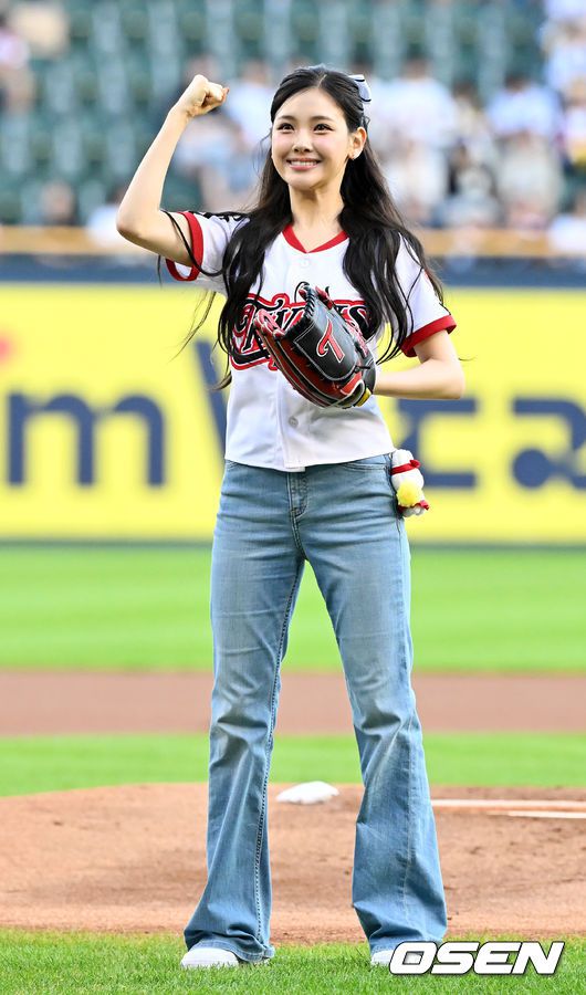 [OSEN=잠실, 민경훈 기자] 20일 오후 서울 잠실구장에서 ‘2025 신한 SOL BANK KBO리그’ LG 트윈스와 롯데 자이언츠의 경기가 열렸다. 이날 경기에서 LG는 임찬규를, 롯데는 이민석을 선발투수로 내세웠다. 경기 전 그룹 베이비돈크라이(Baby DONT Cry)의 이현이 시구를 하고 있다. 2025.07.20 / rumi@osen.co.kr