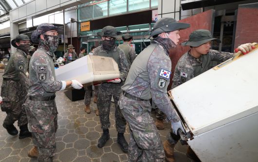육군 32사단 장병들이 지난 18일 집중호우로 침수된 충남 당진시장에서 복구작업을 하고 있다. /뉴스1 |