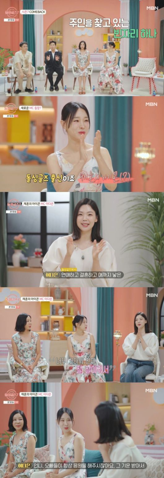 MC 소개에 앞서 유세윤은 "이번 시즌은 특별히 이 자리에 딱 맞는 분이 합류를 한다. 긴장을 많이 하고 있다"며 "'돌싱글즈' 출신이다. 재혼의 아이콘"이라며 이다은을 소개했다. 이혜영은 "우리가 이분 결혼식도 갔잖아요"라며 반갑게 맞이했다.
