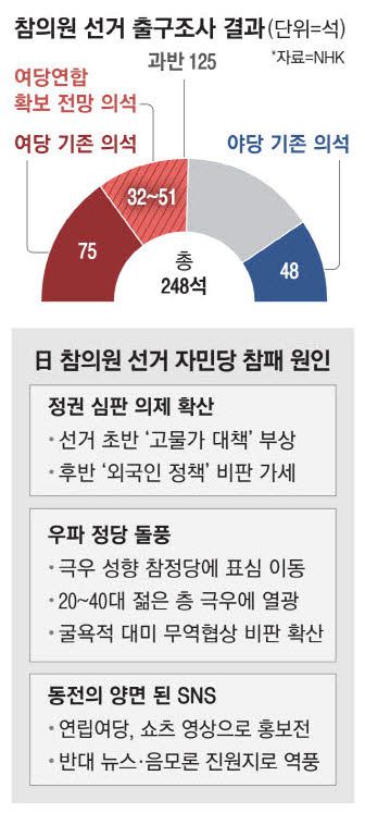 20일 NHK 등 현지 언론은 출구조사를 통해 125명을 뽑는 일본 참의원 선거에서 여당인 자민·공명 연합 의석수를 32~51석으로 예상했다. 직전 의석수인 66석에 못 미칠 뿐 아니라 과반 의석수에 필요한 50석 확보도 쉽지 않을 것이란 분석이다.
