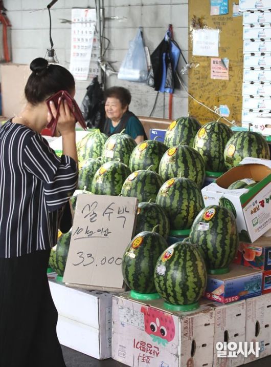 ‘무더위 갈증 해소’라는 소박한 즐거움마저 가격 앞에 망설여지는 현실이다. 사진은 지난 16일 서울 송파구 가락시장에서 수박이 진열돼있는 모습.