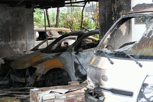 18일 경기 광명시의 한 아파트에서 발생한 화재 현장에 차량들이 불에 탄 상태로 주차돼 있다. 17일 이 아파트 주차장 필로티에서 불이 나 3명이 숨지고 60여 명이 부상을 입었다. 남동균 인턴기자 |