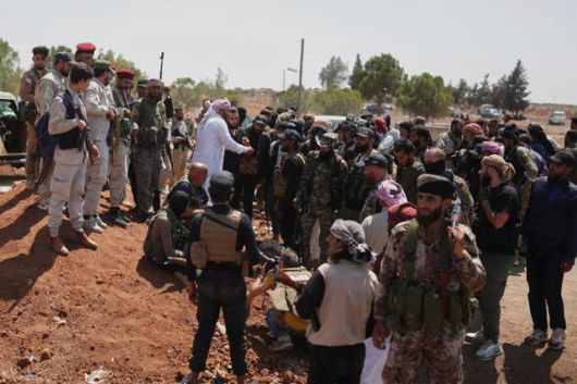 시리아 정부군(왼쪽)이 20일 베두인족 전사들의 스웨이다 진입을 막고 있는 모습. 스웨이다=AP 연합뉴스 |