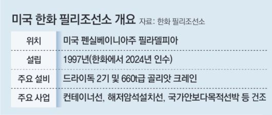 필리조선소는 현재 미 동부에서 대형 선박 건조가 가능한 유일한 조선소다. 한화그룹은 수년간 제대로 가동되지 않아 ‘녹슨 유산’으로 평가받던 이 쇠락한 조선소를 지난해 1억 달러(약 1400억 원)에 인수했다. 인수 뒤 곧바로 한국에서 50여 명의 전문가를 파견해 기술과 공정 노하우 등을 전수하고 있다. 용접 로봇, 자동화 설비 등 한국 조선업의 ‘스마트 야드’ 시스템도 접목하고 있다.