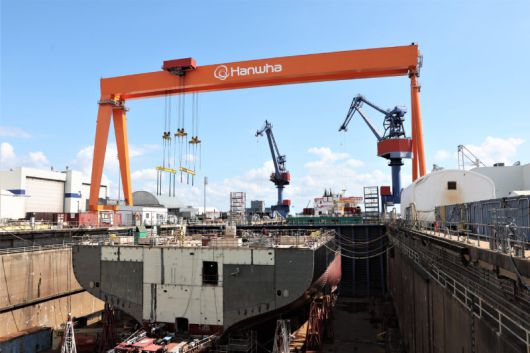 미국 펜실베이니아주 필라델피아의 한화 필리조선소 4번 독(dock)에서 ‘다목적 훈련함(NSMV)’이 건조되고 있다. 한화 필리조선소 제공 |