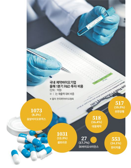 바이오기업들의 R&D 투자 기조는 이보다 더 공격적이다. 삼성바이오로직스는 1분기 1073억 원을 R&D에 투자해 전년보다 22.3% 늘렸고, 셀트리온은 매출의 12.3%에 해당하는 1031억 원을 투입했다. SK바이오사이언스는 같은 기간 매출 대비 17.7%에 해당하는 27억 원을 R&D에 썼다.