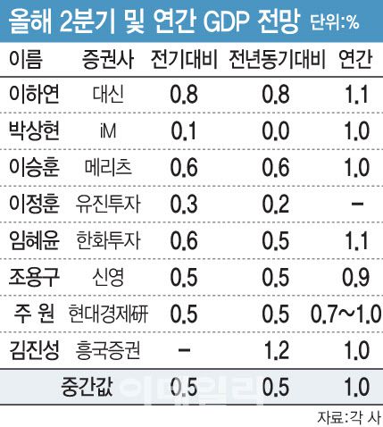 20일 이데일리가 국내 증권사·경제연구소 연구원 8명을 대상으로 설문조사한 결과 올 2분기 전기 대비 성장률은 0.5%(중간값)로 집계됐다. 직전 분기 -0.2%의 역성장 충격에서 벗어나 미약한 회복세를 보일 것이란 전망이다. 한국은행은 오는 24일 올해 2분기 국내총생산(GDP) 속보치를 발표한다