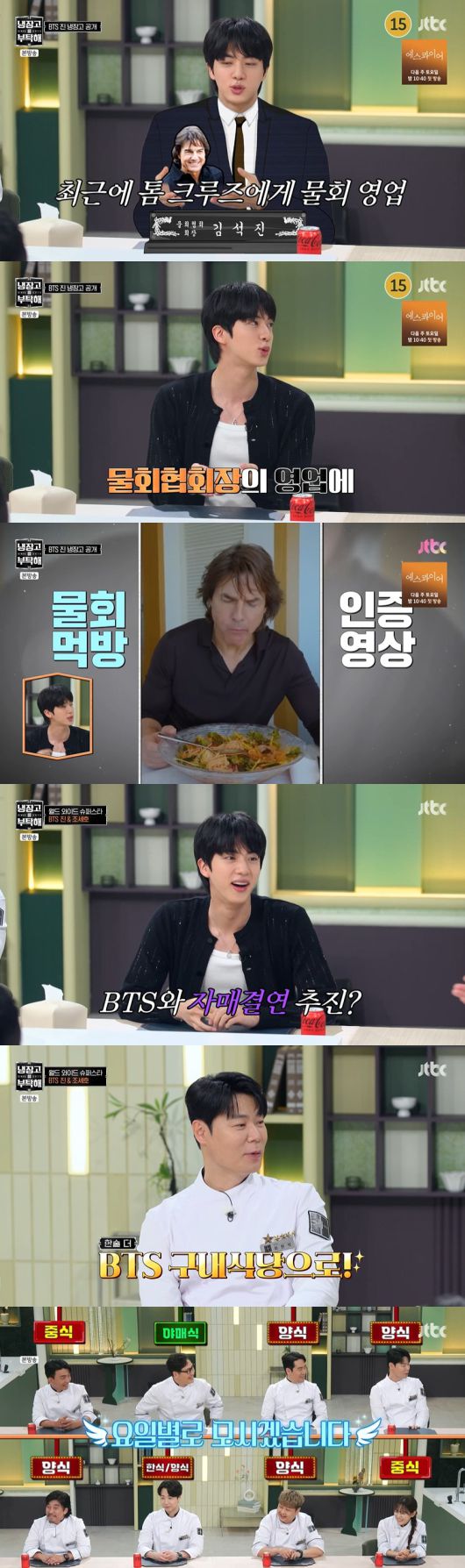 20일 방송된 JTBC '냉장고를 부탁해'(이하 '냉부해')에서는 '월드 와이드 핸섬' BTS 진과 풋풋한 신혼 생활 중인 '사랑꾼' 조세호가 게스트로 출연했다.