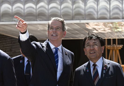 스콧 베선트 미국 재무장관(왼쪽)이 지난 19일(현지시간) 일본 오사카에서 열린 오사카 세계 박람회 2025에서 아카자와 료세이 경제재생상과 함께 기념 촬영을 하고 있다. [EPA] |