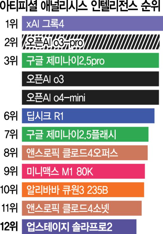 아티피셜 애널리시스는 이번 발표에서 총 20위까지 지능 지표를 공개했는데 문샷AI가 개발한 ‘키미 K2’와는 같은 점수를 기록했으며, 라마4 ‘매버릭(51점)’과 ‘스카우트(43점)’를 가뿐히 제쳤다. 가장 높은 점수를 차지한 서비스는 xAI의 ‘그록4(73점)’였으며 오픈AI의 ‘o3-프로(71점)’, 구글의 ‘제미나이 2.5 프로(70점)’, 딥시크의 ‘R1(68점)’ 등도 상위권에 이름을 올렸다.