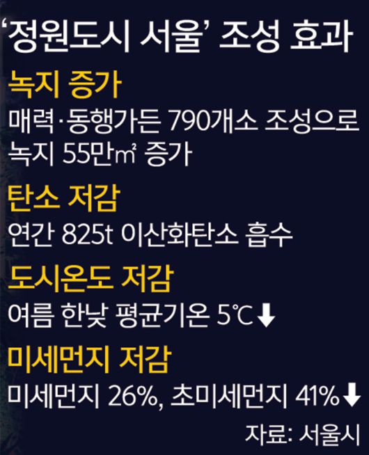 전문가들은 도심 속 녹지 확대를 효과적인 기후위기 대응 수단으로 보고 있다. 국립산림과학원에 따르면 최근 2년간 서울에 새로 확충된 55만㎡의 녹지공간은 연간 825t의 이산화탄소를 흡수할 수 있는 수준이다. 유엔기후변화협약은 산림을 해양, 습지 등과 더불어 주요 탄소흡수원 중 하나로 인정하고 있다.