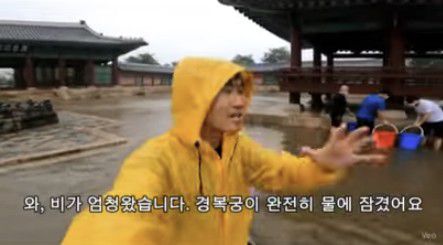 노란 우비를 입은 남성이 경복궁을 배경으로 말한다. 뒤로는 바지를 걷은 사람들이 양동이로 물을 퍼낸다. 그러다 화면을 돌리자 갑자기 물개가 물에 잠긴 궁내를 수영하는 모습이 나타난다. "잠깐, 저거 물개야? 대박, 물개야!"