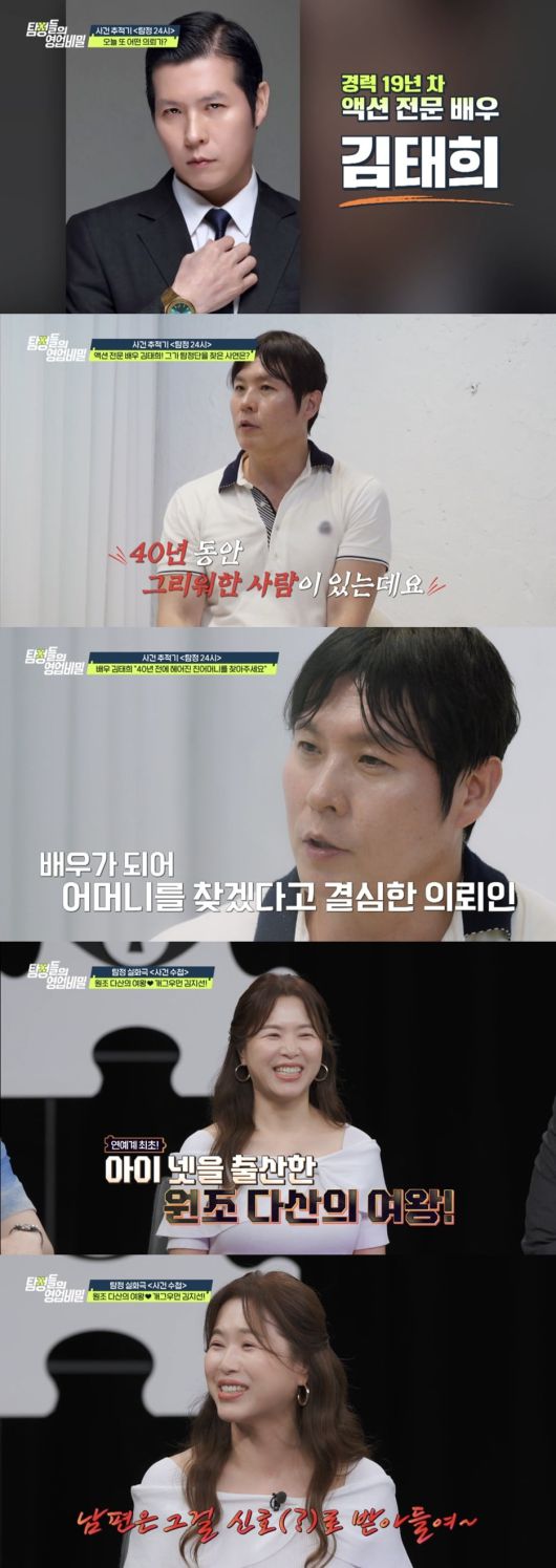 21일 방송되는 채널A 예능 '탐정들의 영업비밀'에는 영화 '극한직업', '한산' 등에 출연하며 다양한 배역을 소화한 경력 19년 차 액션 전문 배우 김태희의 의뢰가 접수된다. 도깨비 탐정단과 만난 김태희는 "40년 동안 그리워한 사람이 있다"며 친어머니를 찾아달라고 부탁한다. 김태희는 "5살 때 부모님의 이혼으로 아버지, 형과 함께 살게 됐고, 어머니와는 헤어지게 됐다"라고 사연을 전한다. 그리고 헤어진지 4년쯤 지났을 무렵, 김태희를 찾아온 어머니가 자장면을 사주며 "학교 열심히 잘 다니고 있으면 만나러 올게"라고 했던 약속을 떠올린다. 그러나 그 말을 마지막으로 김태희는 40년 동안 어머니를 볼 수 없었다고.