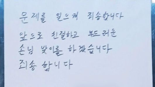 '문제를 일으켜 죄송합니다. 앞으로 친절하고 부드러운 손님 맞이를 하겠습니다, 죄송합니다'라고 자필로 적혀 있습니다.