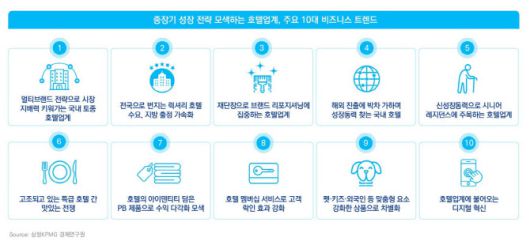 삼정KPMG는 국내 호텔 시장의 주요 10대 트렌드로 △멀티브랜드 전략 △지방 출점 확대 △브랜드 리포지셔닝 △해외 진출 가속화 △시니어 레지던스 진출 △호텔 레스토랑 경쟁 심화 △PB(자체 브랜드) 사업 확대 △호텔 멤버십 서비스 강화 △객실 상품 차별화 △디지털 혁신 등을 제시했다.