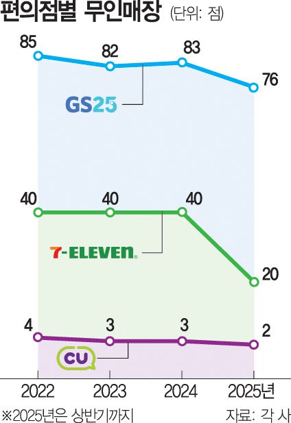 이 같은 추세는 다른 편의점도 마찬가지다. CU의 완전무인점포는 2022년 4점에서 올해 상반기 2점으로 절반 줄었다. 세븐일레븐은 완전무인점포를 40점으로 유지하다가 올해 상반기 20점으로 급감했다. 편의점 3사를 통틀어 2022년과 비교해 올해 24%의 무인매장이 문을 닫은 셈이다.