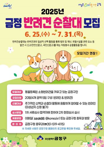 금정 반려견 순찰대 신청모집은 e-메일 및 방문 신청을 받고 있으며, 기존 18일까지 모집이었던 기간을 늘려 31일까지 연장해 신청받고 있으며, 자세한 사항은 금정구청 홈페이지를 통해 확인할 수 있다.