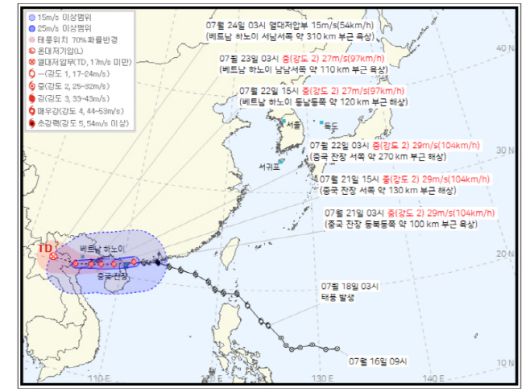 이날 오후 3시에는 잔장 서쪽 약 130km 부근 해상으로의 도착이 예상된다. 22일 15시에는 베트남 하노이 동남동쪽 약 120km부근 해상으로 접근한다.
