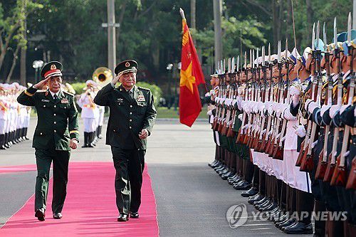 지난해 10월 베트남 방문 당시 의장대를 사열하는 판 반 장 베트남 국방부 장관(좌)과 장유샤 중국 중앙군사위원회 부주석 [EPA 연합뉴스 자료사진] |
